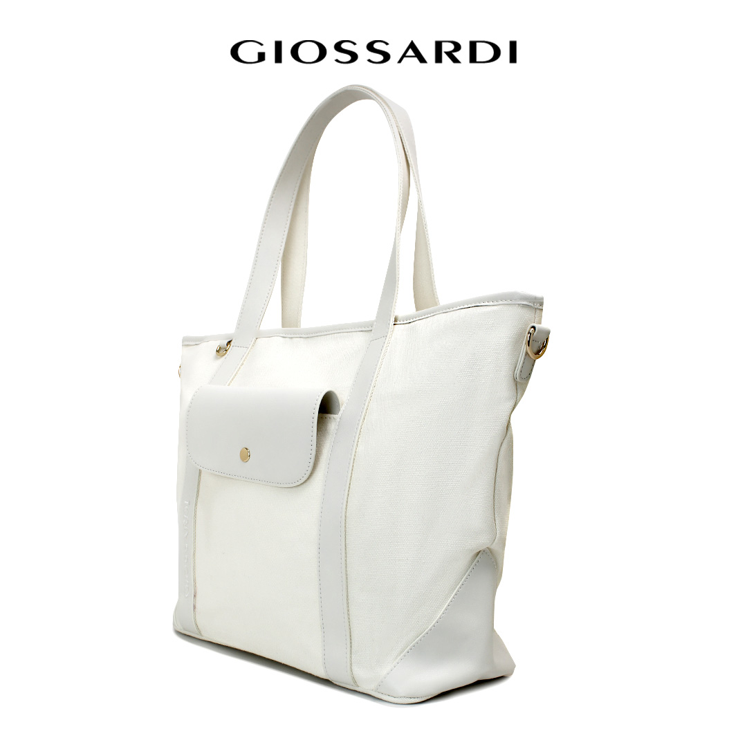 GIOSSARDI Urban Canvas Tote Bag – GHB1822CN3BG4 : This spacious tote bag in green and white is perfect for your travels! It easily fits all your essentials and can be placed on your luggage for added convenience!